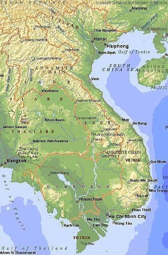 Vietnam ligt op het schiereiland Indochina en grenst in het noorden aan China, in het zuidoosten aan Cambodja en in het noordwesten aan Laos. Vietnam heeft een hele lange kustlijn met in het noorden de Golf van Tonkin, in het zuiden de Zuid Chinese zee en het grenst ook nog een stukje aan de Golf van Thailand.